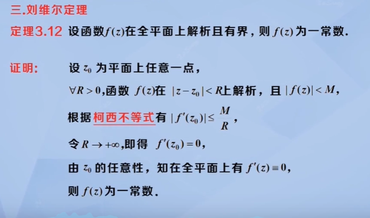 设函数f(z)在全平面上解析且有界,则f(z)为一常数。